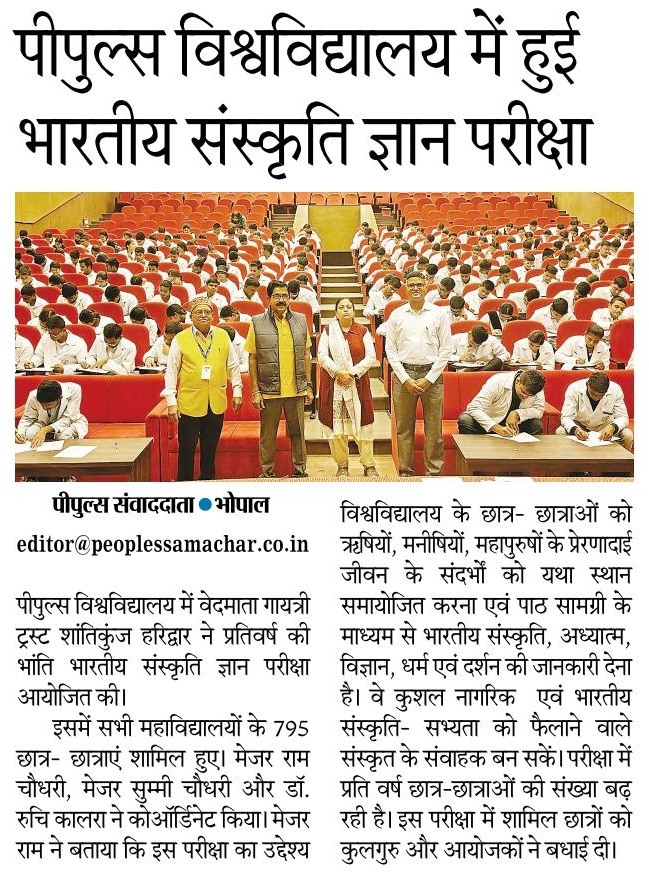 पीपुल्स विश्वविद्यालय में प्रतिवर्ष की भांति इस वर्ष भी वेदमाता गायत्री ट्रस्ट शांतिकुंज हरिद्वार के द्वारा दिनांक 21 11 2025 को आयोजित भारतीय संस्कृत ज्ञान  परीक्षा  पीपुल्स  विश्वविद्यालय में आयोजित किया गया जिसमें  विश्वविद्यालय के 795 छात्र- छात्राओं ने परीक्षा में सम्मिलित हुएI  भारतीय संस्कृत ज्ञान परीक्षा कराने का उद्देश्य-: पीपुल्स  विश्वविद्यालय में  अध्यनरत छात्र- छात्राओं को ऋषियों, मनीषियो, महापुरुषों के प्रेरणादाई जीवन के विभिन्न संदर्भों को यथा स्थान समायोजित करना एवं पाठ सामग्री के माध्यम से छात्र- छात्राओं  के लिए विभिन्न स्तर पर भारतीय संस्कृति, अध्यात्म, विज्ञान, धर्म एवं दर्शन की जानकारी उपलब्ध कराने के साथ-साथ विभिन्न स्तर पर होने वाली  प्रतियोगी परीक्षाओं में भी लाभदायक सिद्ध हो सके, एवं एक कुशल नागरिक  एवं भारतीय संस्कृति- सभ्यता को फैलाने वाले संस्कृत के संवाहक की भूमिका भविष्य में निभा सके, इस परीक्षा में बैठने वाले छात्र- छात्राए  भविष्य में जहां भी रहे अन्य विद्यार्थियों की तुलना में गरिमा पूर्ण एवं मानवीय मूल्यों को जीवन में महत्वपूर्ण स्थान देते हुए जीवन यापन करेंI भारतीय संस्कृत ज्ञान परीक्षा कराने का परिणामपीपुल्स विश्वविद्यालय  में भारतीय संस्कृति ज्ञान परीक्षा आयोजित होने का परिणाम यह देखा जा रहा  है कि प्रत्येक वर्ष आयोजित होने वाली इस परीक्षा में प्रतिवर्ष छात्र-छात्राओं का रुझान बढ़ता ही जा रहा है और परीक्षा में सम्मिलित होने वाले विद्यार्थियों की संख्या लगातार बढ़ती जा रही है इससे यह प्रतीत होता है कि छात्र- छात्राओं की भारतीय संस्कृति, अध्यात्म,- विज्ञान एवं जीवन जीने की कला के प्रति रुझान निरंतर बढ़ता हुआ दिख रहा हैI
