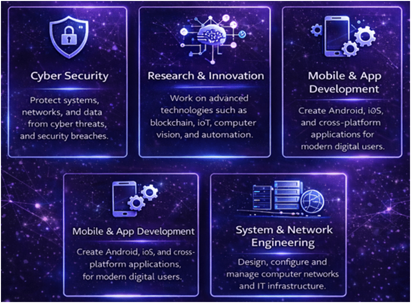 The department aims to develop technical skills, problem-solving abilities, and innovation among students. Through practical labs, projects, internships, and workshops, students gain hands-on experience in emerging fields such as Artificial Intelligence, Cybersecurity, Data Science, and Cloud Computing.
