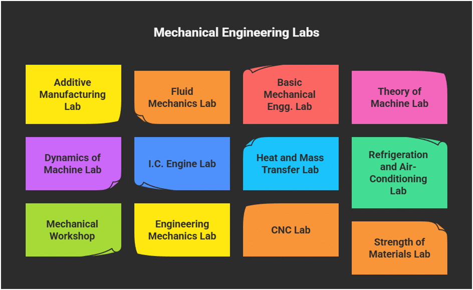 The department is supported by well-equipped laboratories and workshop facilities including Fluid Mechanics, Heat & Mass Transfer, Refrigeration & Air Conditioning, CNC, Dynamics of Machines, Strength of Materials, 3D Additive Manufacturing, and E-Vehicle Technology.
