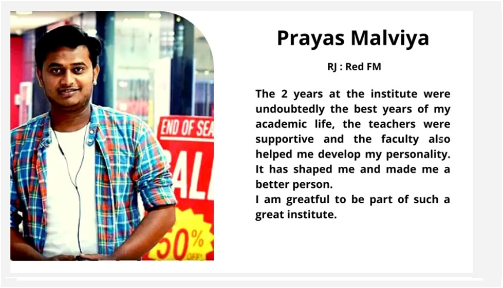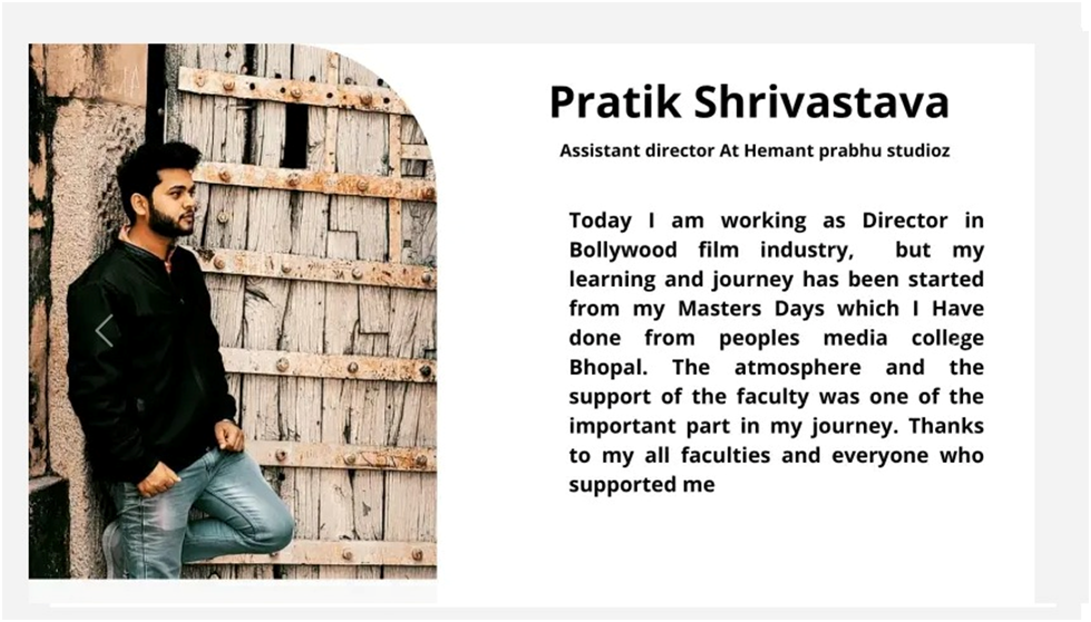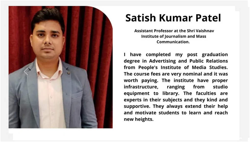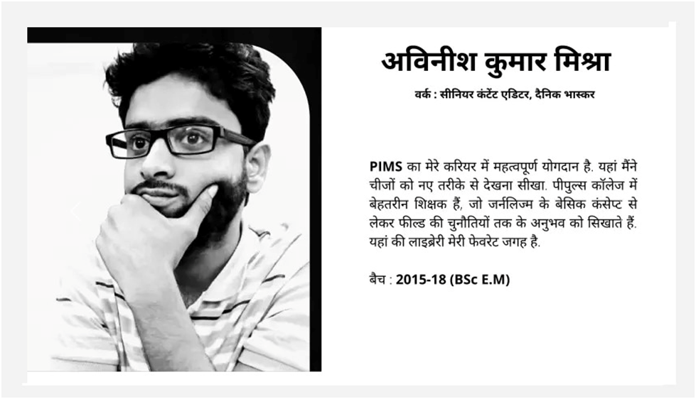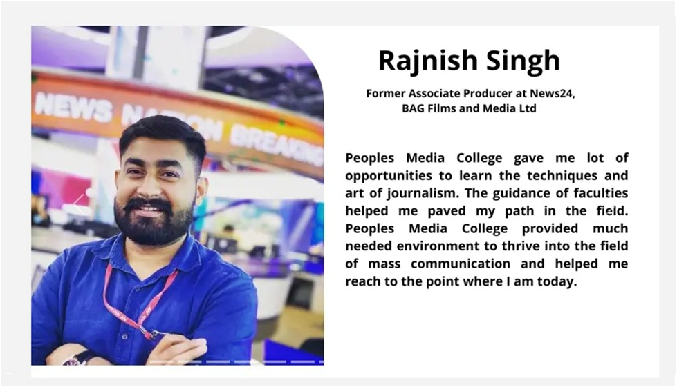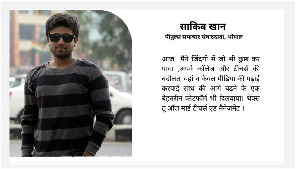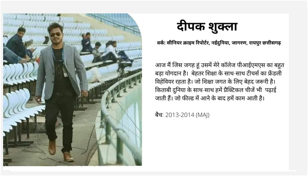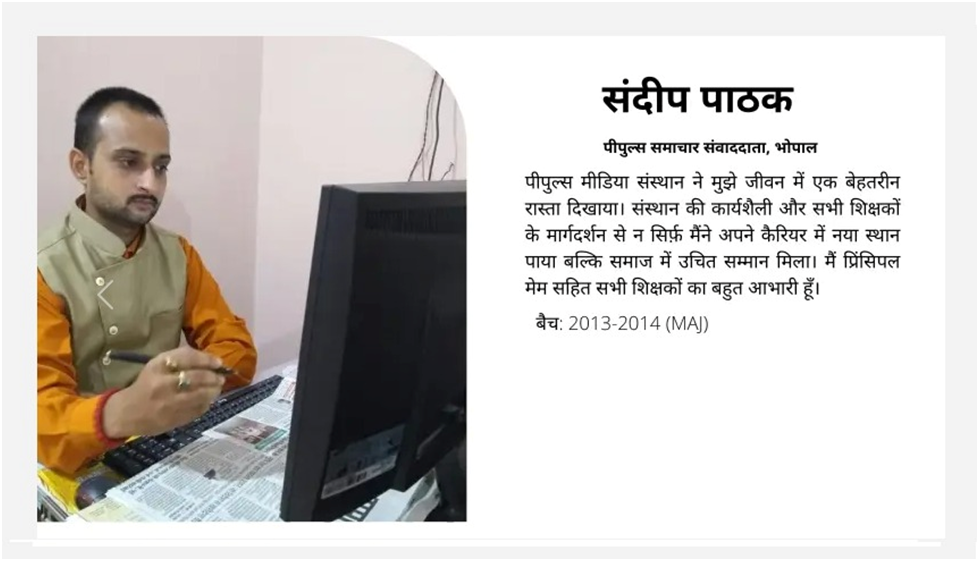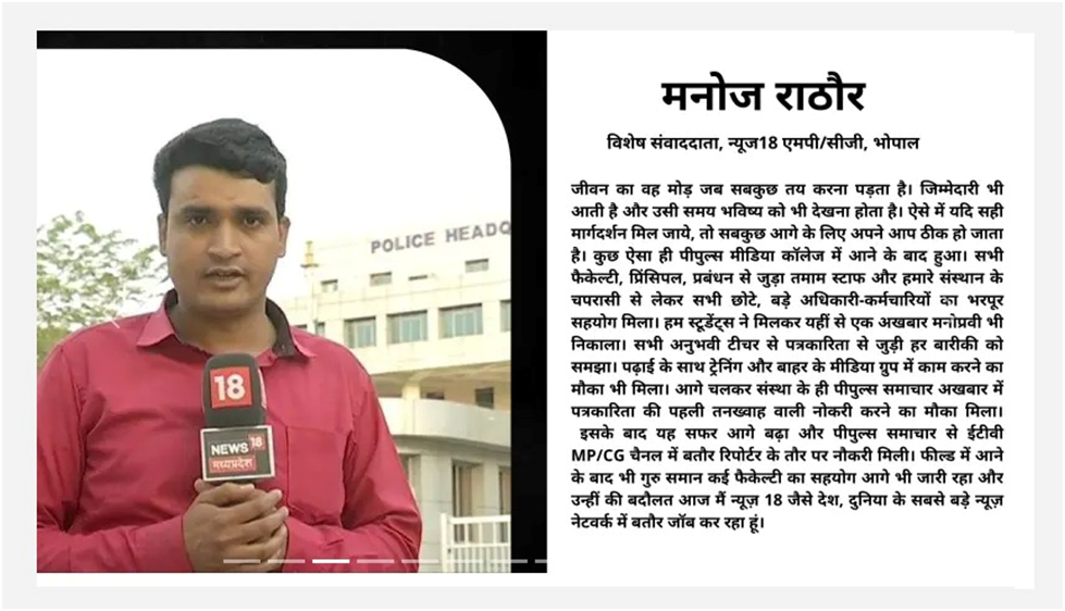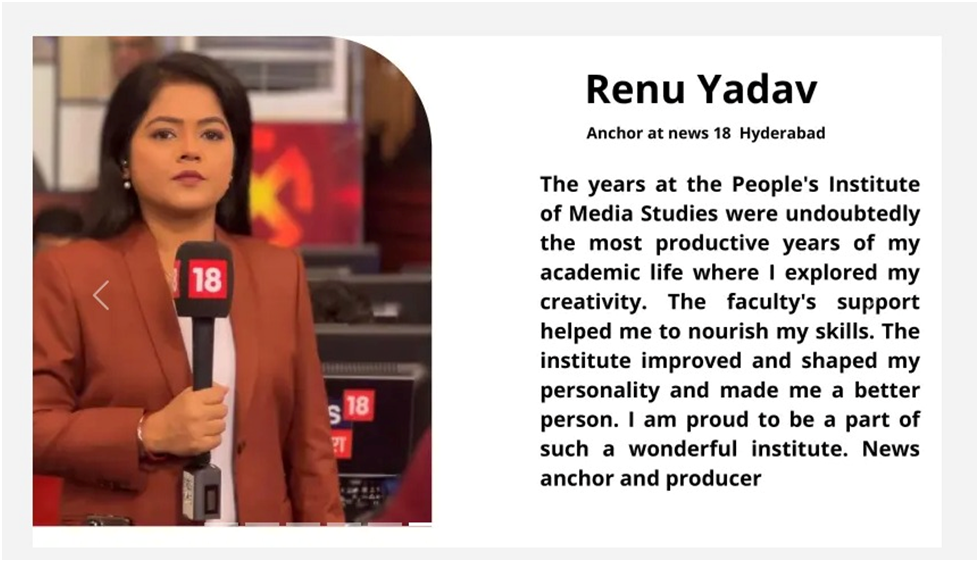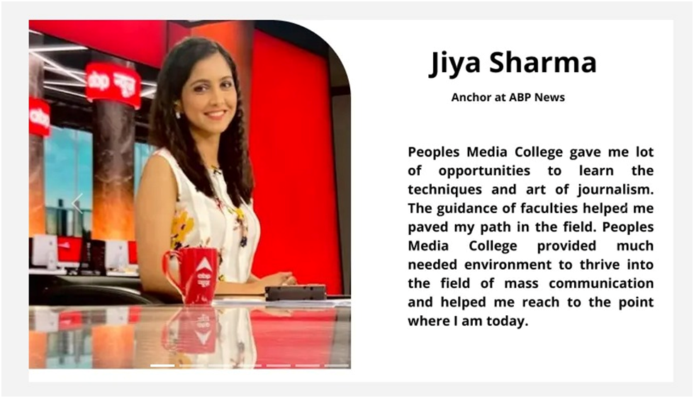 Our alumni are successfully working with reputed media organizations like ABPNews, Zee News, DB, RajyeSabha TV,IBC, CNBC, News18, AAJTAK, India TV, Hindustan, Doordarshan, and more.