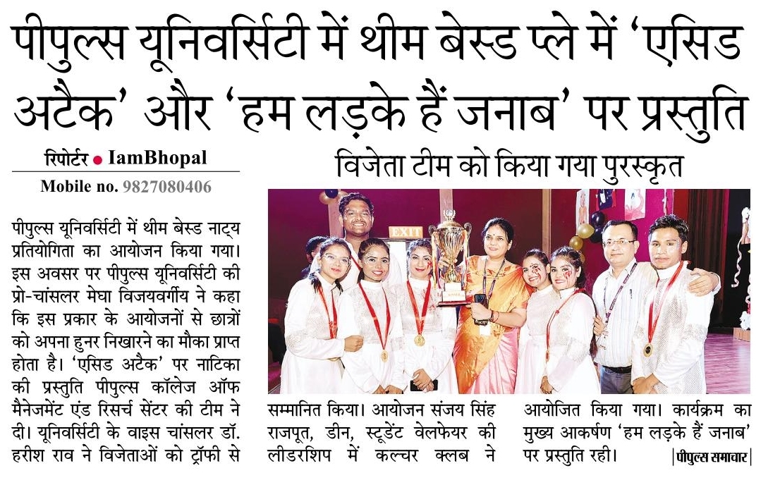 - पीपुल्स यूनिवर्सिटी में थीम बेस्ड प्ले में ‘एसिड अटैक’ और ‘हम लड़के हैं जनाब’ पर प्रस्तुति – 15-Sep, 2025