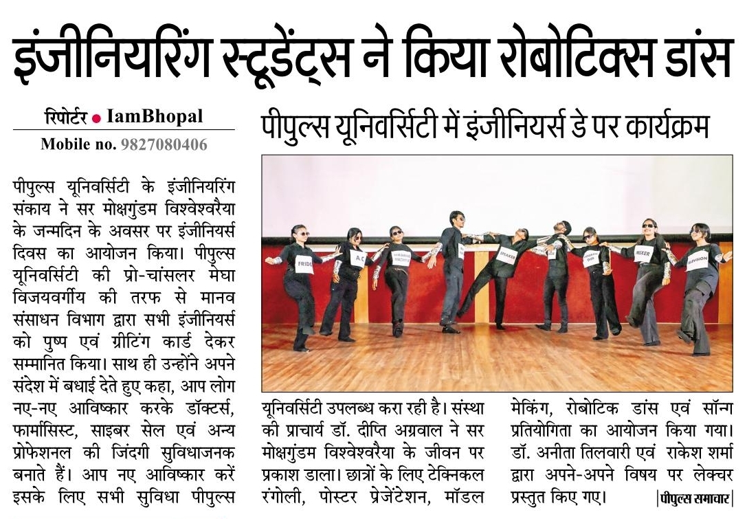 - पीपुल्स यूनिवर्सिटी में इंजीनियर्स डे पर कार्यक्रम, इंजीनियरिंग स्टूडेंट्स ने किया रोबोटिक्स डांस. – 16-Sep, 2025