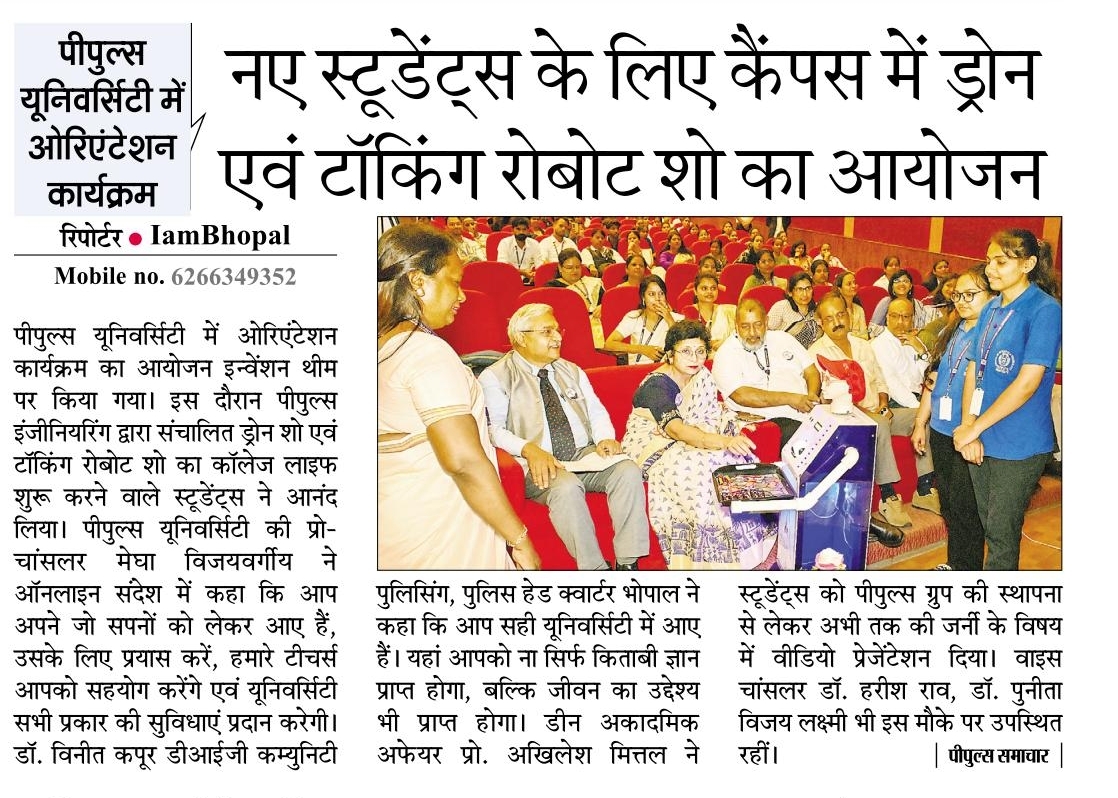 - पीपुल्स यूनिवर्सिटी में ओरिएंटेशन कार्यक्रम, नए स्टूडेंट्स के लिए कैंपस में ड्रोन एवं टॉकिंग रोबोट शो का आयोजन. – 18-Sep, 2025