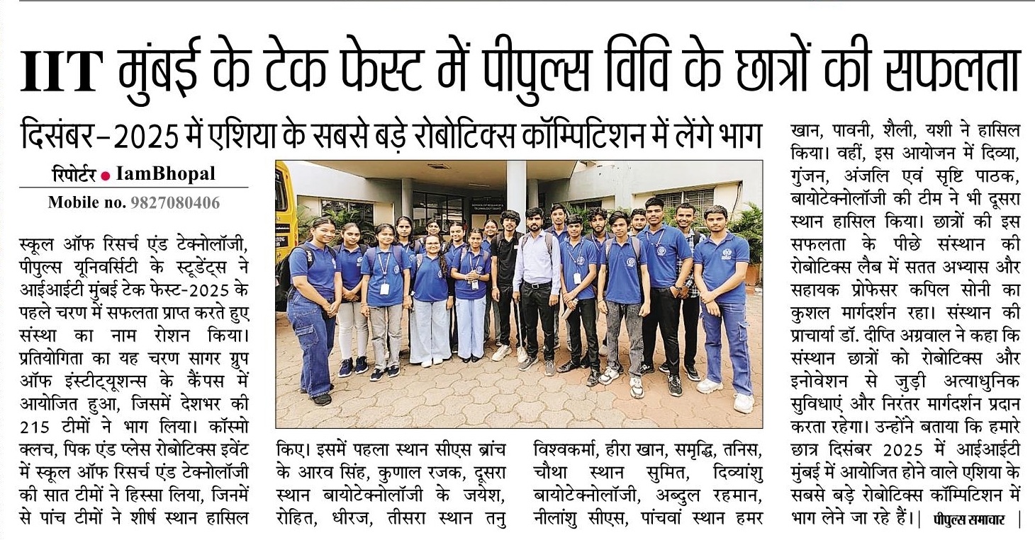 - IIT मुंबई के टेक फेस्ट में पीपुल्स विवि के छात्रों की सफलता, दिसंबर-2025 में एशिया के सबसे बड़े रोबोटिक्स कॉम्पिटिशन में लेंगे भाग. – 07-Oct-2025