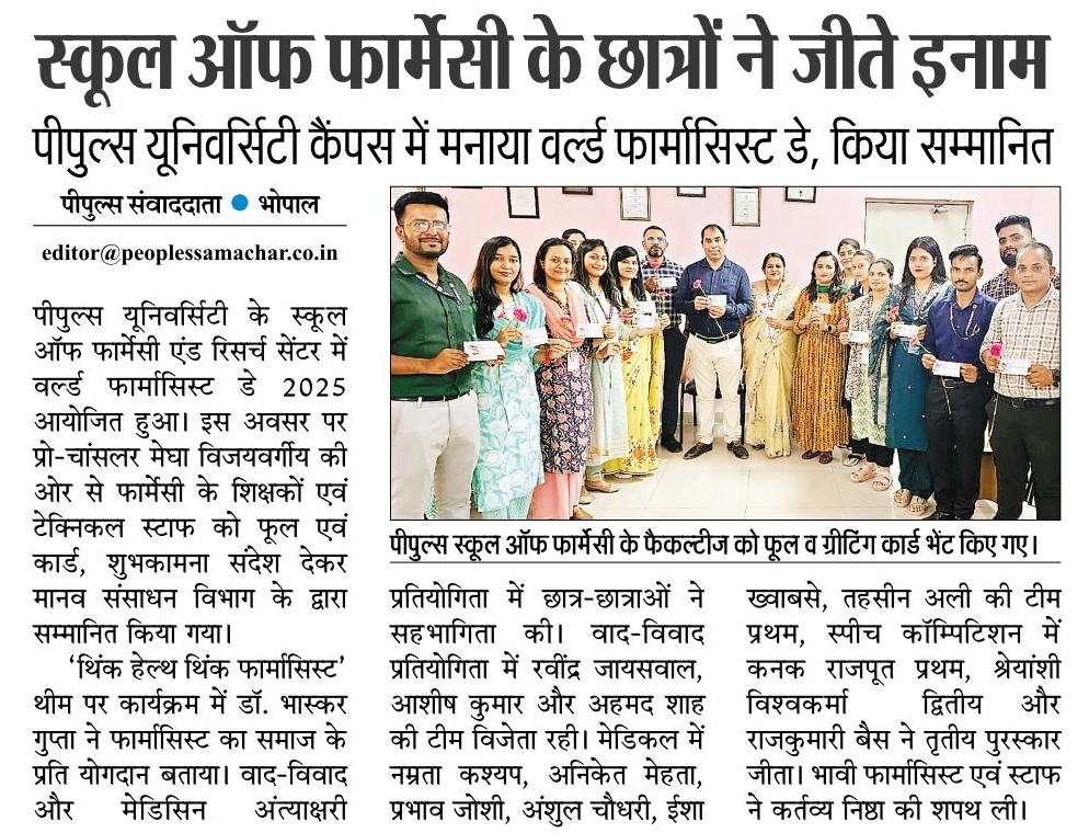 - स्कूल ऑफ फार्मेसी के छात्रों ने जीते इनाम, पीपुल्स यूनिवर्सिटी कैंपस में मनाया वर्ल्ड फार्मासिस्ट डे, किया सम्मानित – 26-Sep, 2025