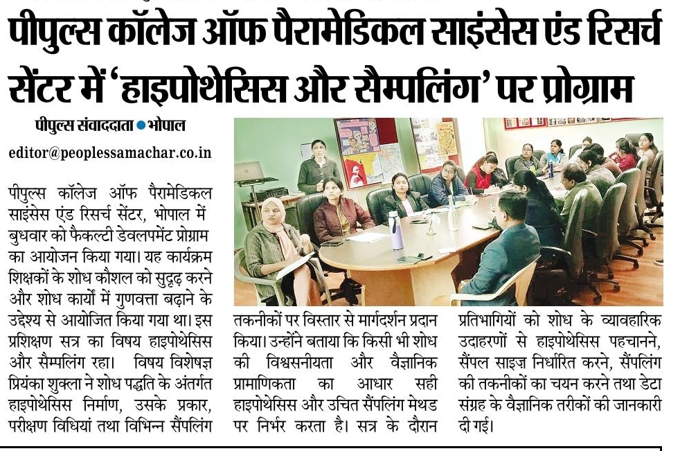 - पीपुल्स कॉलेज ऑफ पैरामेडिकल साइंसेस एंड रिसर्च सेंटर में ‘हाइपोथेसिस और सैम्पलिंग’ पर प्रोग्राम – 19 Nov, 2025