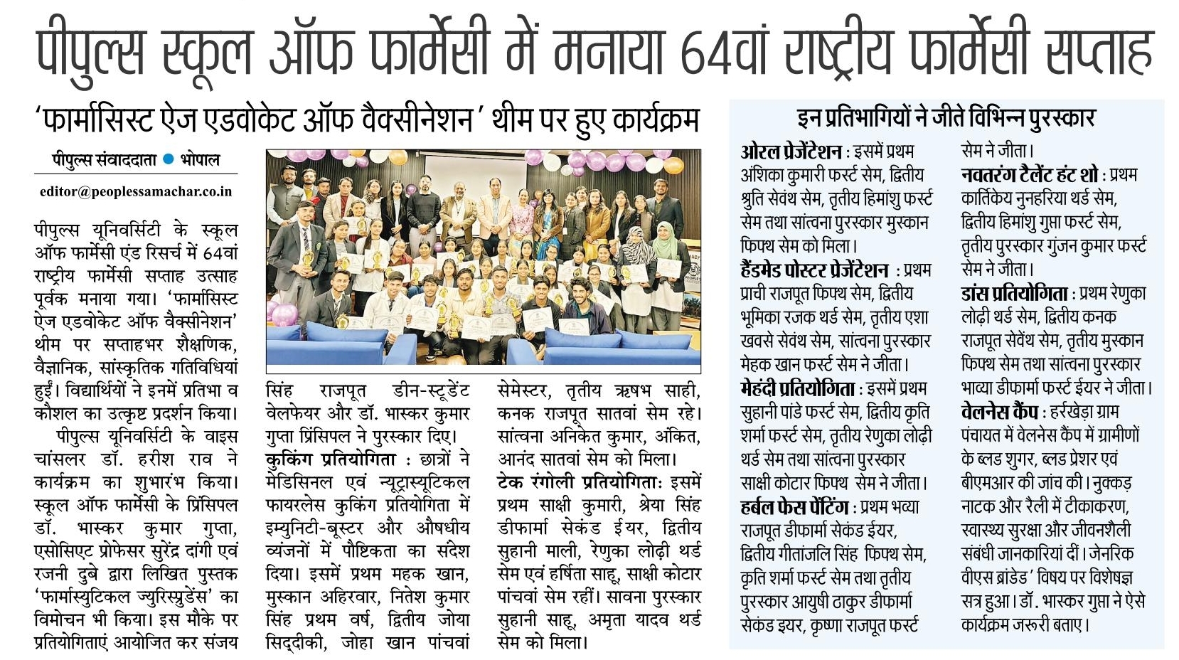 - पीपुल्स स्कूल ऑफ फार्मेसी में मनाया 64वां राष्ट्रीय फार्मेसी सप्ताह – 05 Dec, 2025