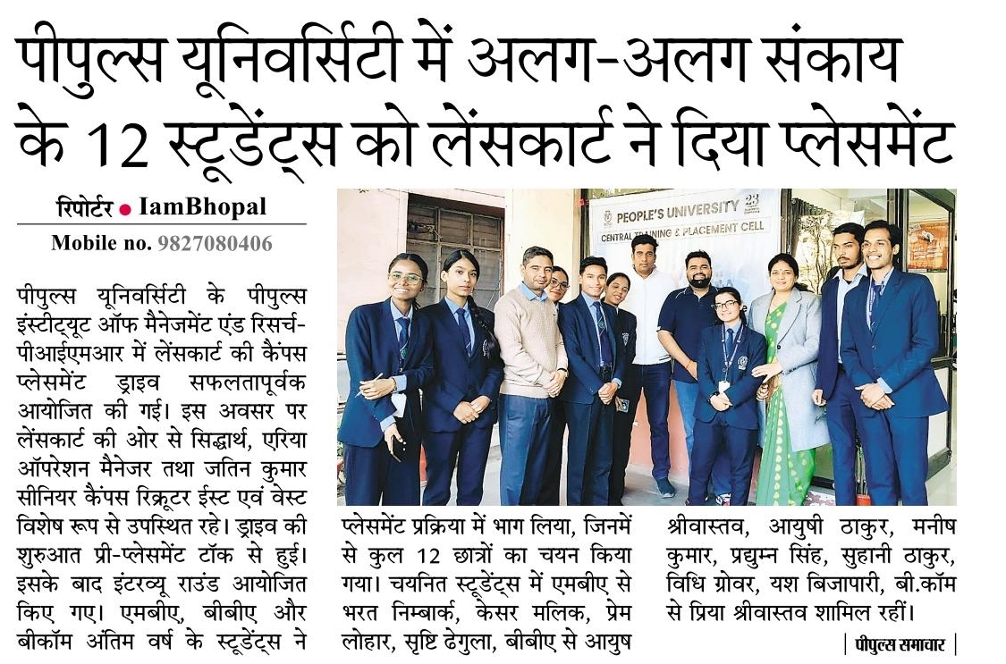 - पीपुल्स यूनिवर्सिटी में अलग-अलग संकाय के 12 स्टूडेंट्स को लेंसकार्ट ने दिया प्लेसमेंट– 11 Dec, 2025